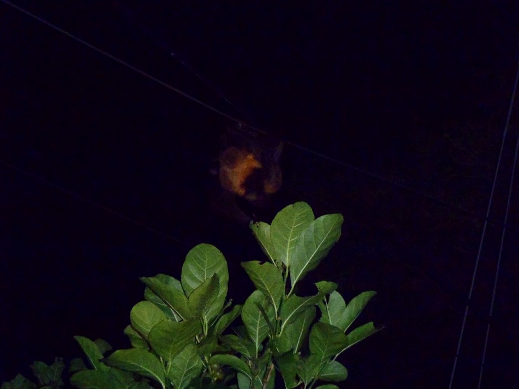 暗くてよくわからないのですが、葉っぱの上の電線にクビワオオコウモリが2匹いまして、交尾をしていました。いやん、破廉恥。